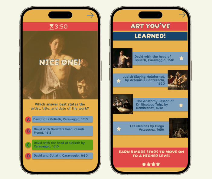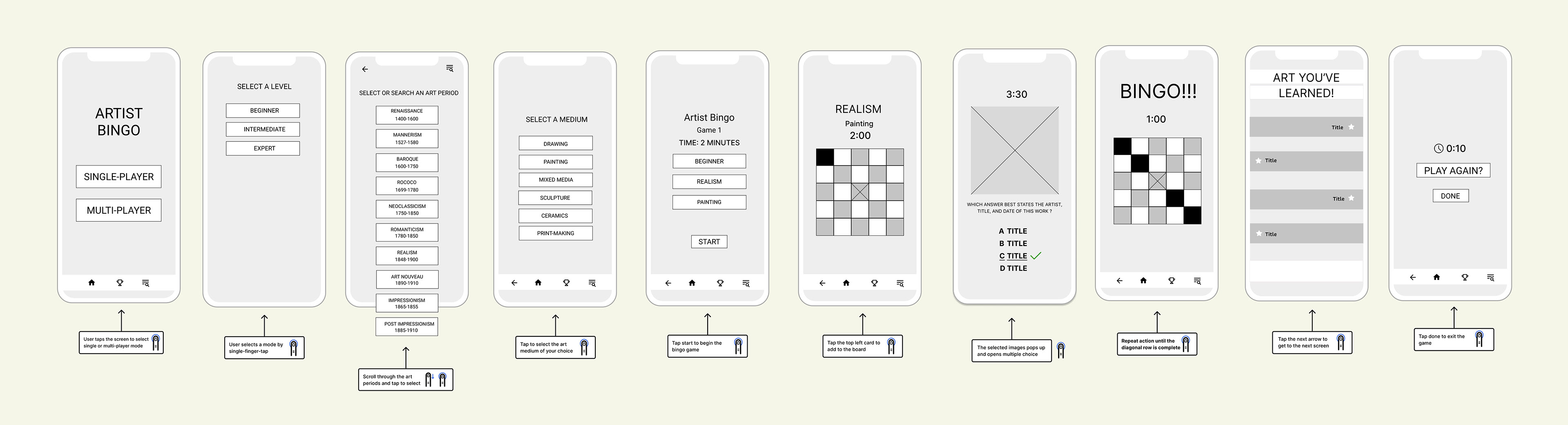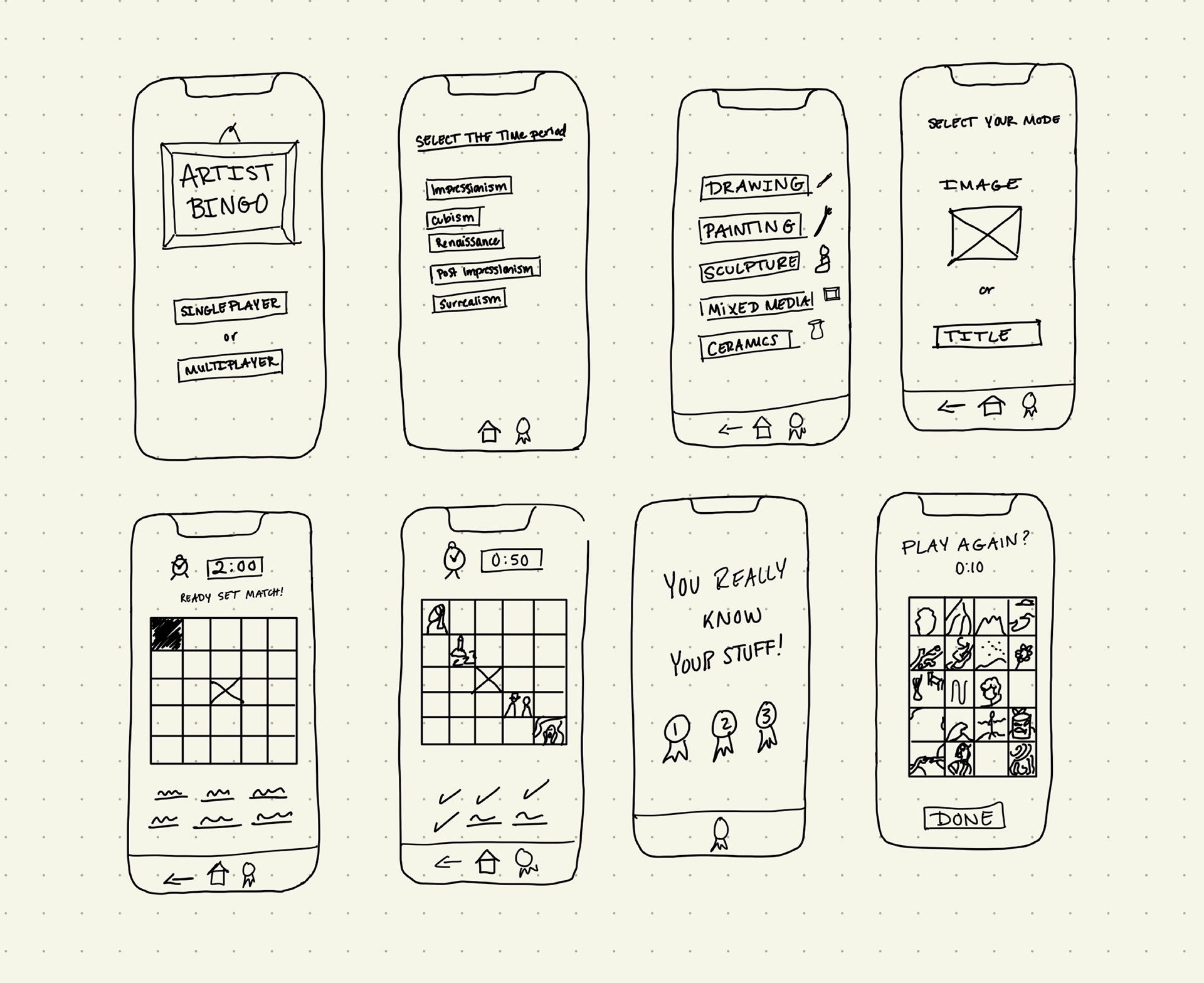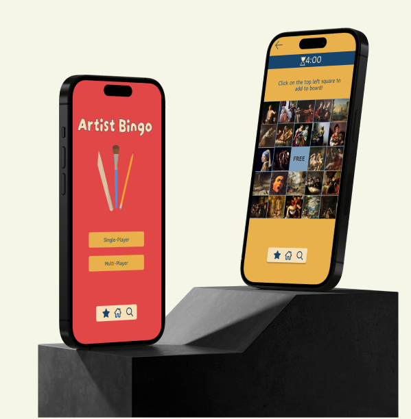 Artist bingo is a game that gives students a chance to study classic works of art in a fun way. Created using Figma, the game is played by picking pieces from a board of the same art category. It's the player's job to correctly guess the title, date, and artist through multiple choice questions before time runs out. When played in single player mode the goal is to beat the clock and guess a whole row either horizontally, vertically, or diagonally. In a multiplayer match between 2-4 players the first person to guess an entire row correctly while also racing against the clock, wins the game and solidifies their art history knowledge.