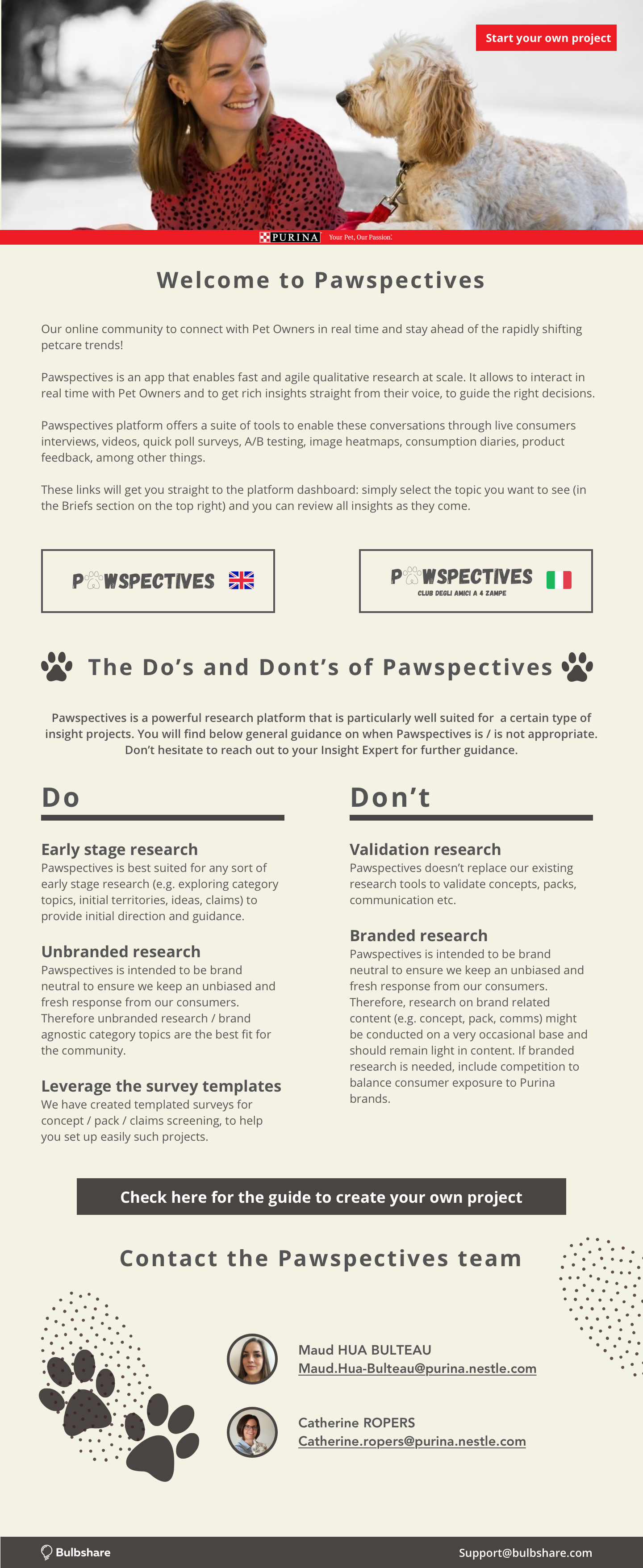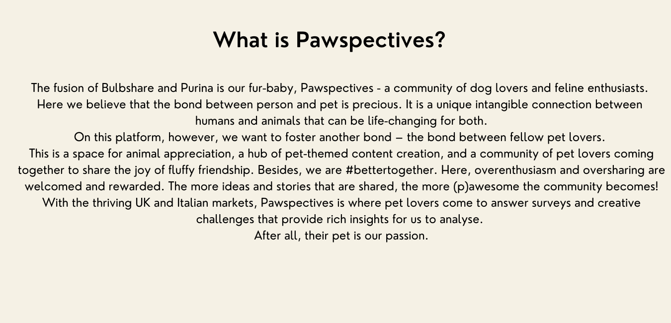This page consists of content from a project I did during my internship with a company called Bulbshare. The goal was to create a webpage layout and login screen design for a company called Purina. This specific landing page and website scroll was for their Purina "Pawspectives" campaign.